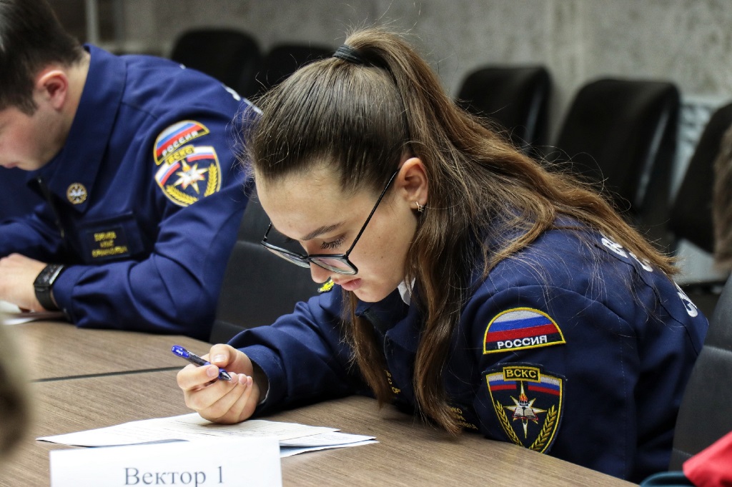 Первый этап был в виде теста, включающего в себя вопросы по оказанию первой помощи и психологической поддержки. Студенты-спасатели отвечали, как правильно остановить кровотечение, провести искусственную вентиляцию лёгких, обработать рану, помочь человеку при острых стрессовых реакциях.