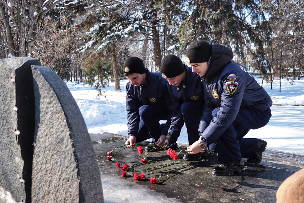 ?Руководство, ветераны, личный состав Главного управления МЧС и кадеты возложили цветы к Вечному огню и памятнику «Пожарным и спасателям».